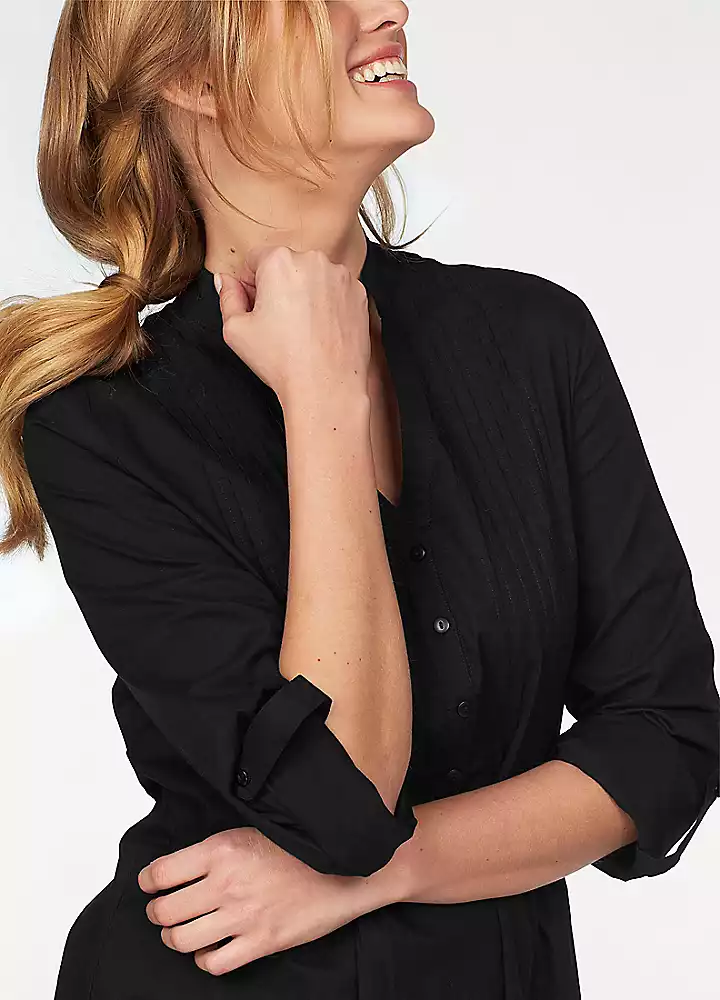Fashionable long cotton blouse with decorative front pleats. In a smart casual style, with half-length button panel leading up to a small stand-up collar. Complete with long roll-up sleeves. Ideal to team with leggings or a pair of skinny jeans.