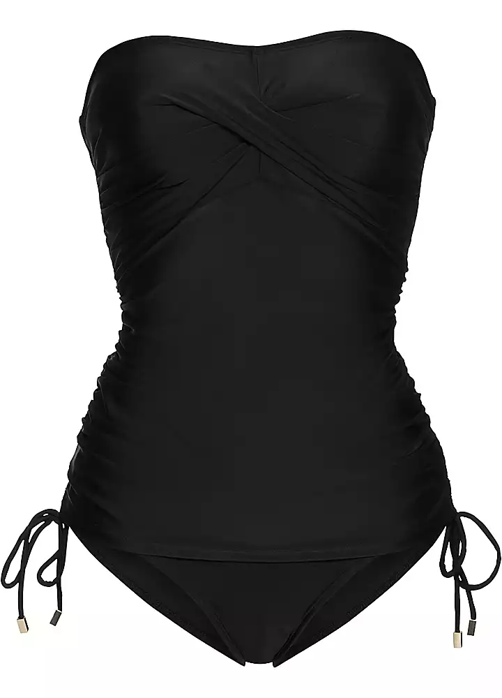 Bandeau style tankini top with ruching detail comes with soft cups and an elasticated underbust with bust lining. Features adjustable and removable straps and adjustable tie sides. Matching bikini bottoms included.