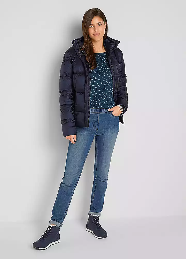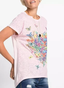 A printed long-sleeve top with decorative button detail. Machine washable.