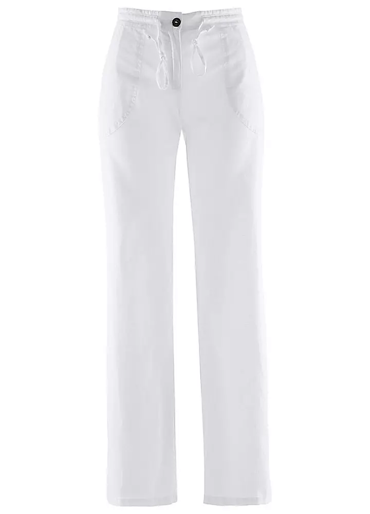 A loose fitting pair of linen-cotton blend trousers with a drawstring waist.
