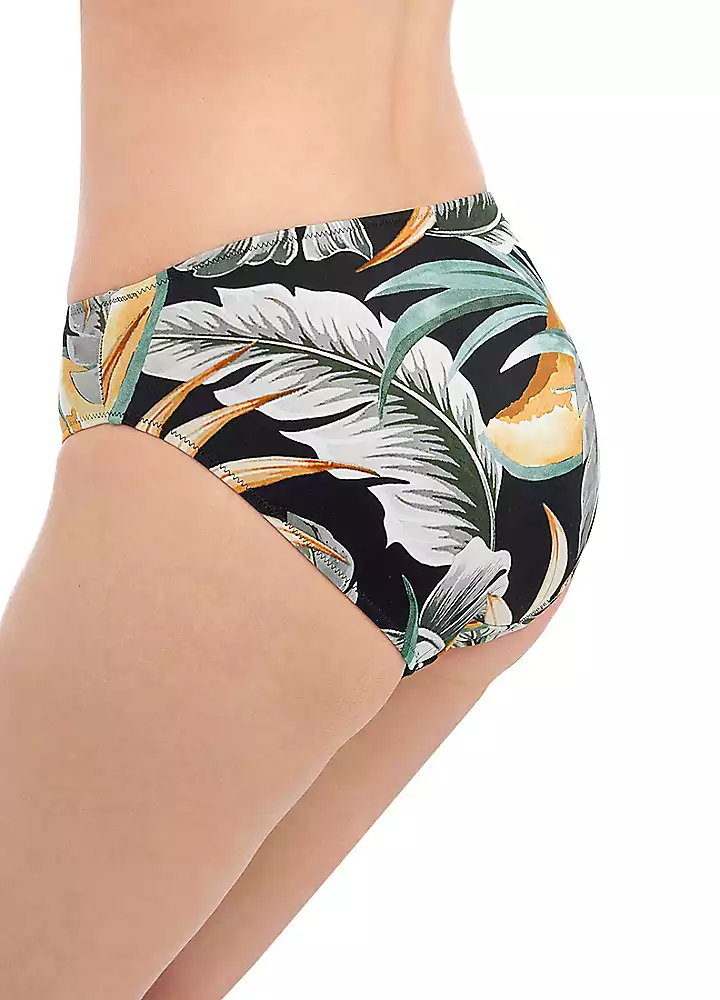 Mid-rise bikini brief features a large-scale botanical print of palm fronds, banana and monstera leaves in a greyscale, illustrated design. The bikini brief offers medium coverage and is fully lined.