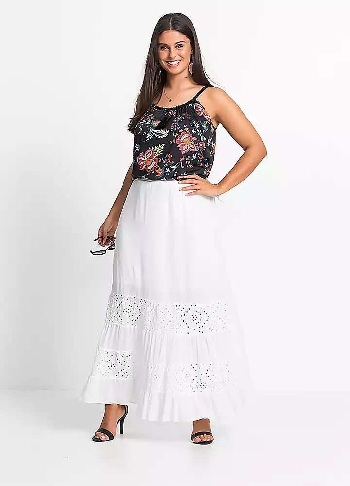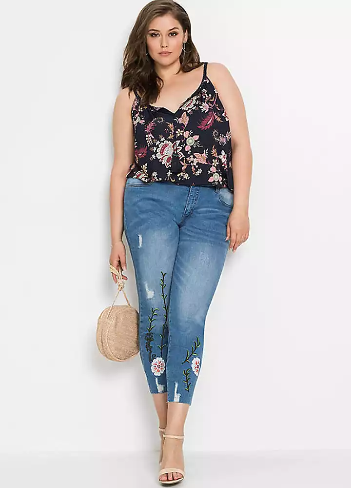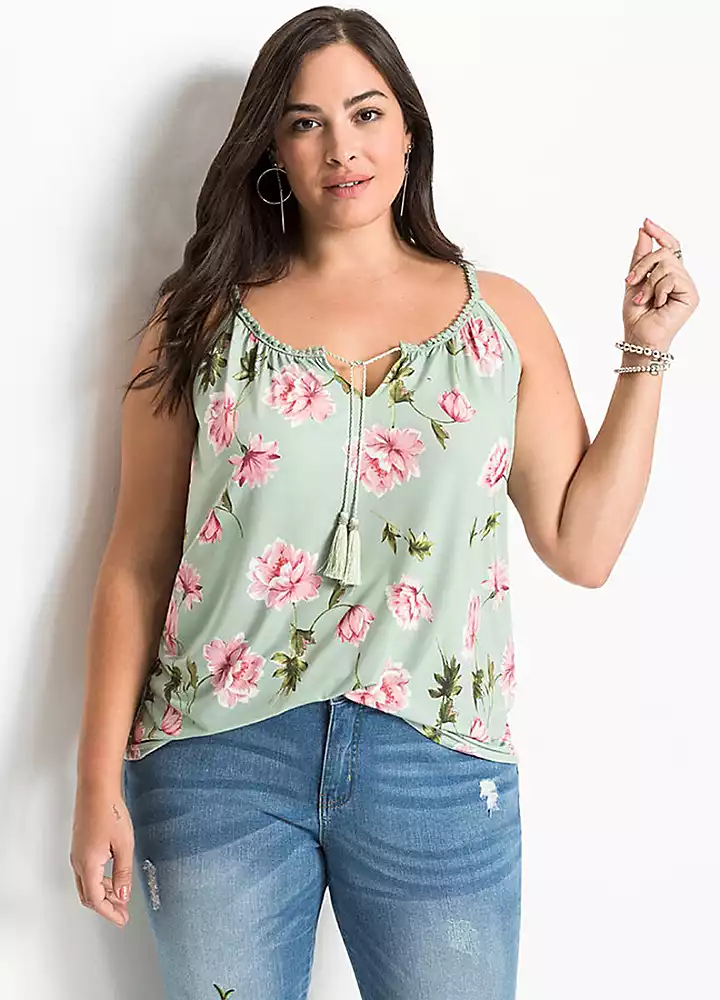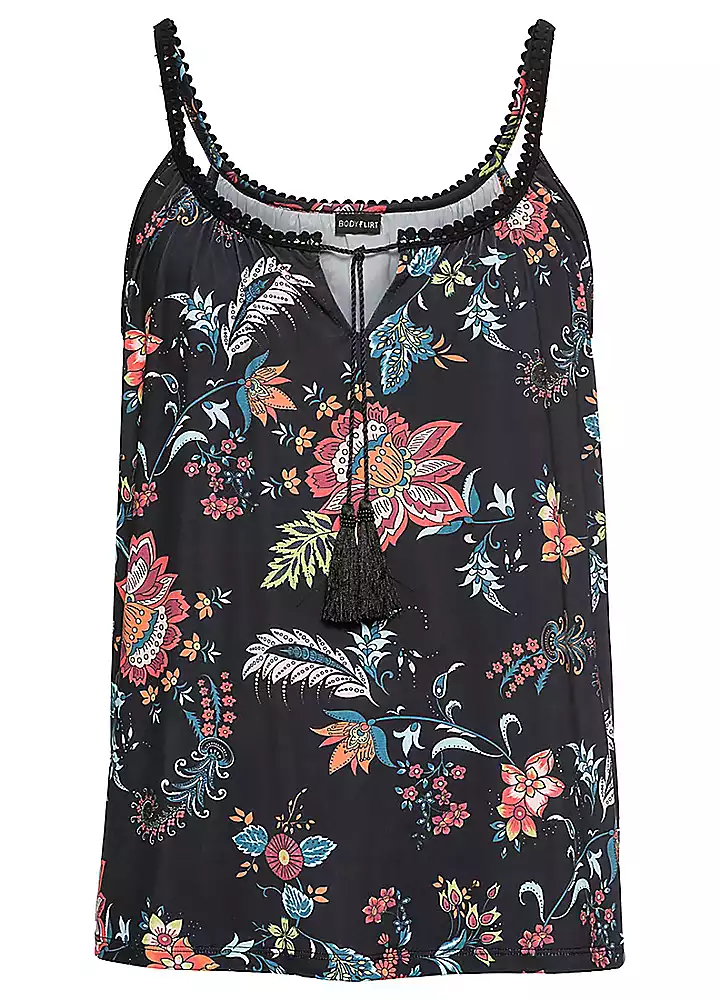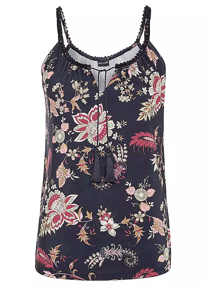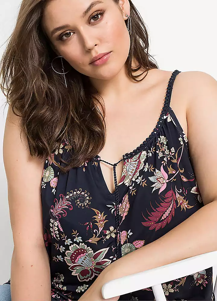 Printed jersey cami with a colourful floral print. Featuring ties at the v-neckline, pretty embellished straps, and comfy stretch material.
