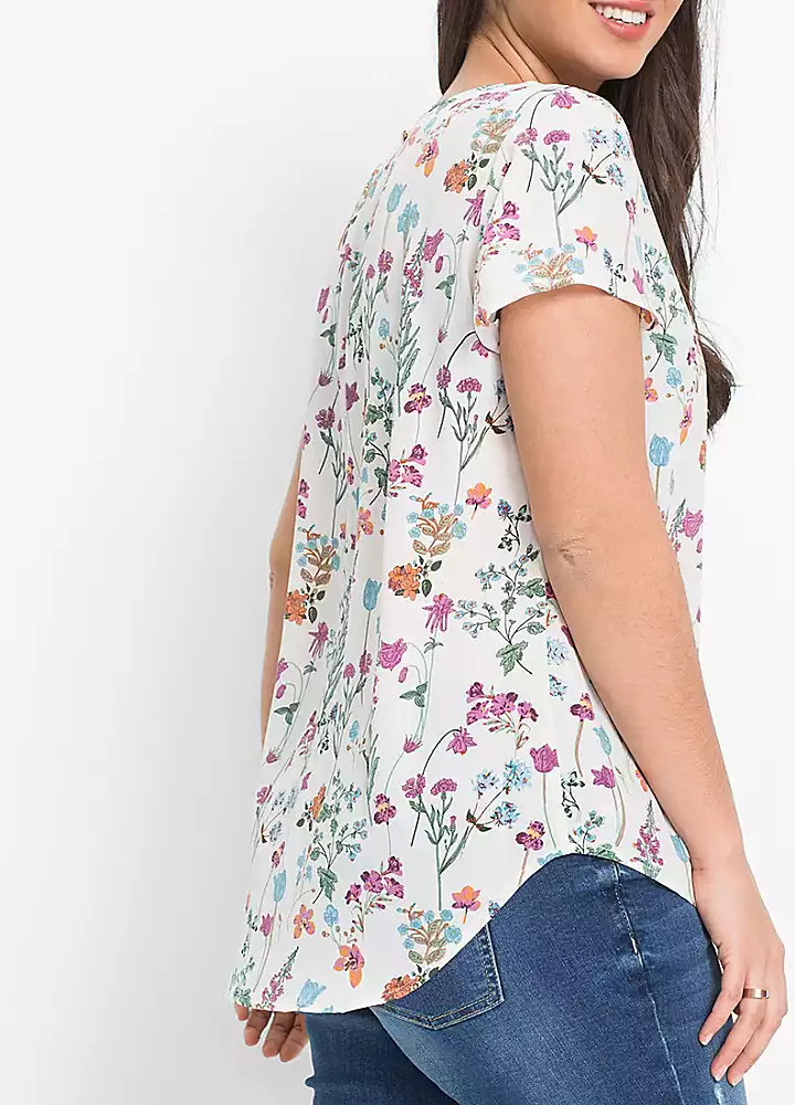 Crafted fro a lightweight fabrucfabric, this short sleeve tunic is designed with a dipped hem and button fastening at the back of the neck. Finished in a pretty floral print that is a perfect companion to denim.