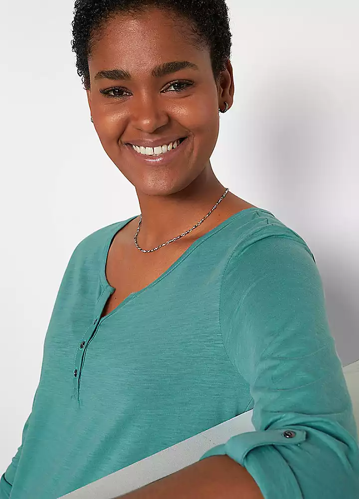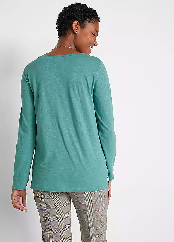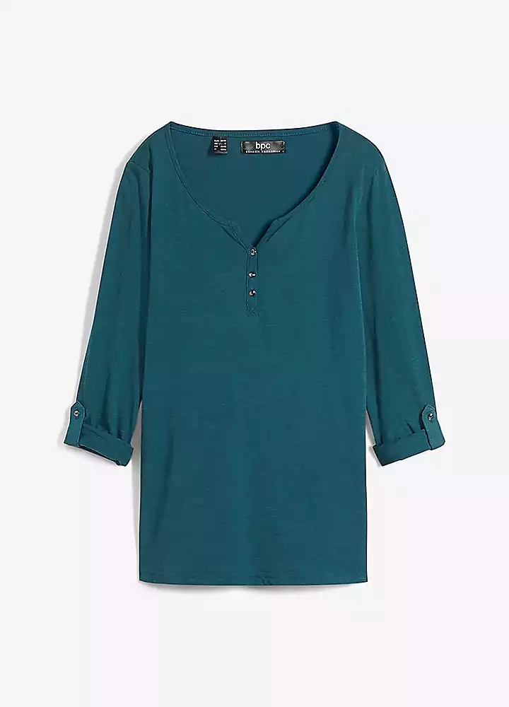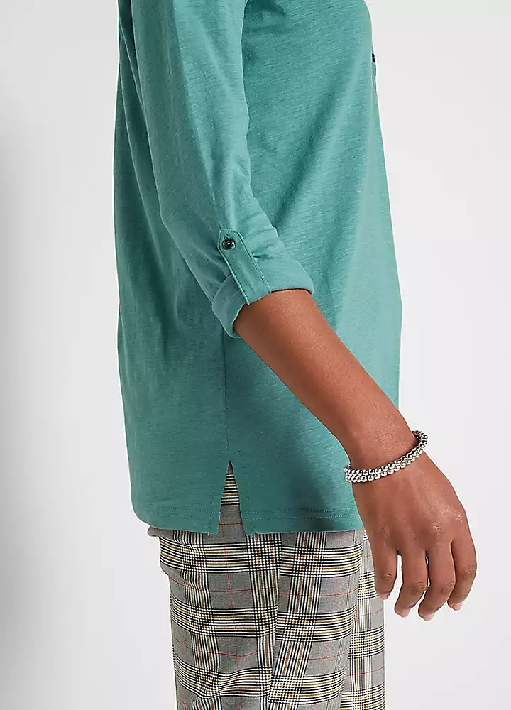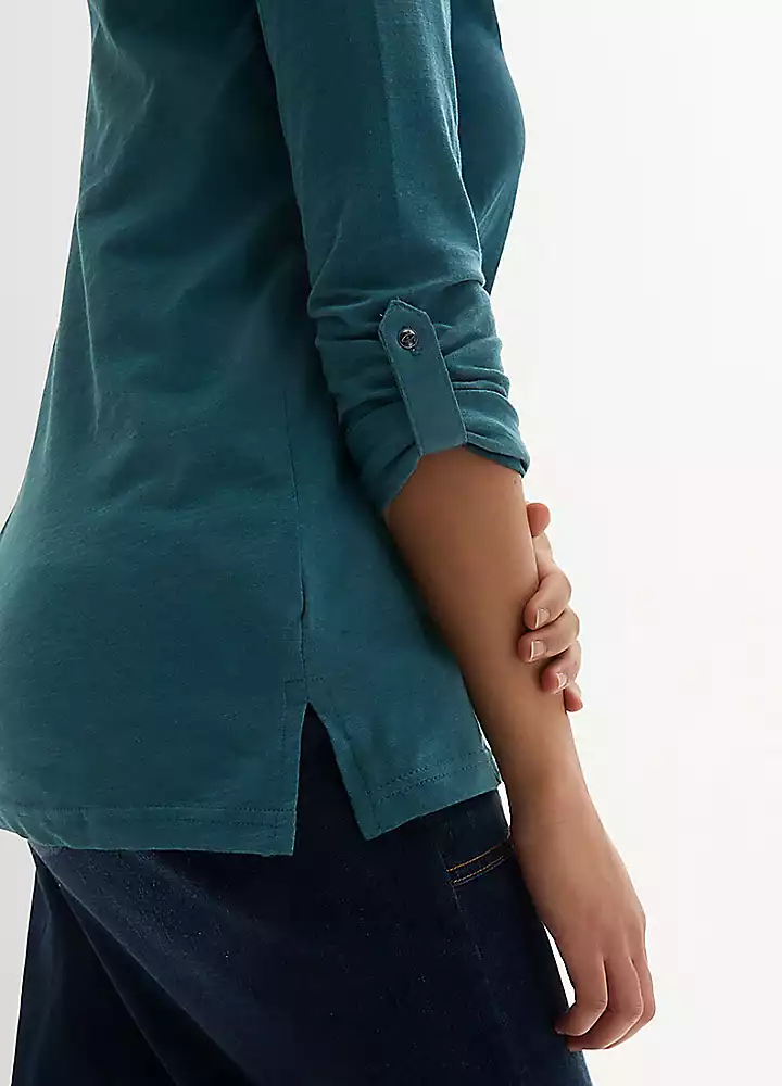 A soft cotton jersey tunic with a short button panel at the collar and turn-up sleeves that can be secured with a bar.