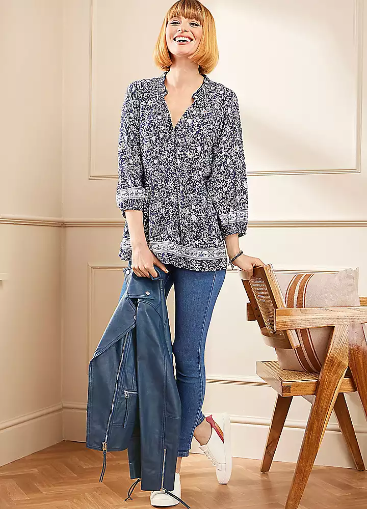 This pretty floral border print blouse will inject a little more excitement into your everyday wardrobe. Designed in a relaxed fit with a mandarin collar and detailed cropped balloon sleeve, this blouse is such an easy-to-wear piece. Style with a pair of jeans and a leather jacket to create a stylish edgy look.