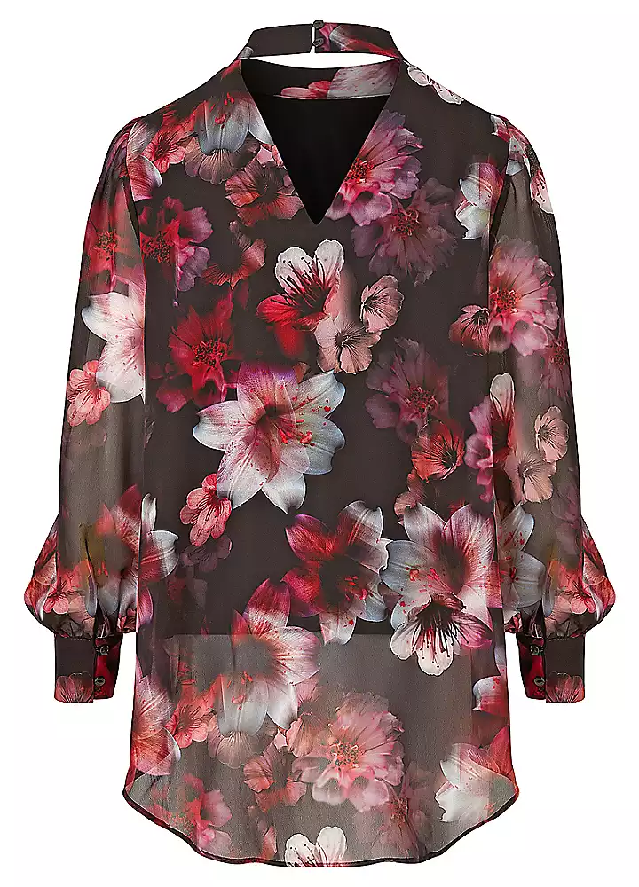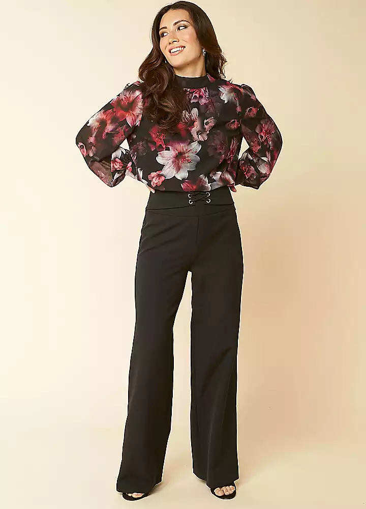 Update your wardrobe with this high-low hem blouse. In a gorgeous floral print, it features a high neckline and low v-neckline to the back. Looks great worn with corset detail trousers.
