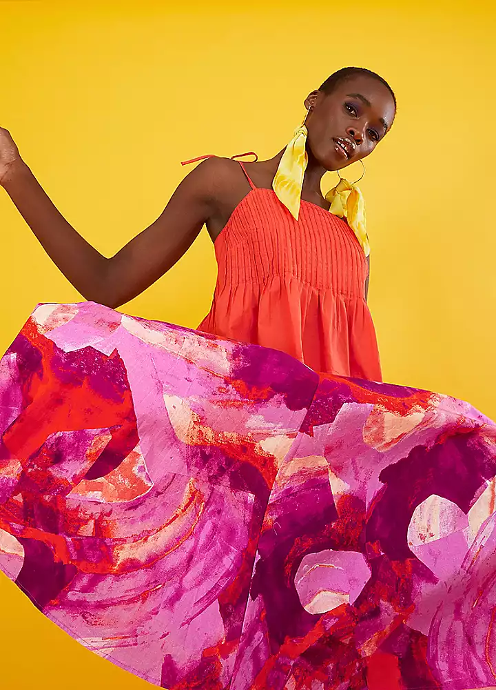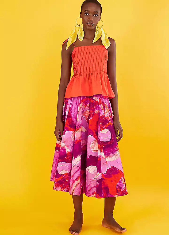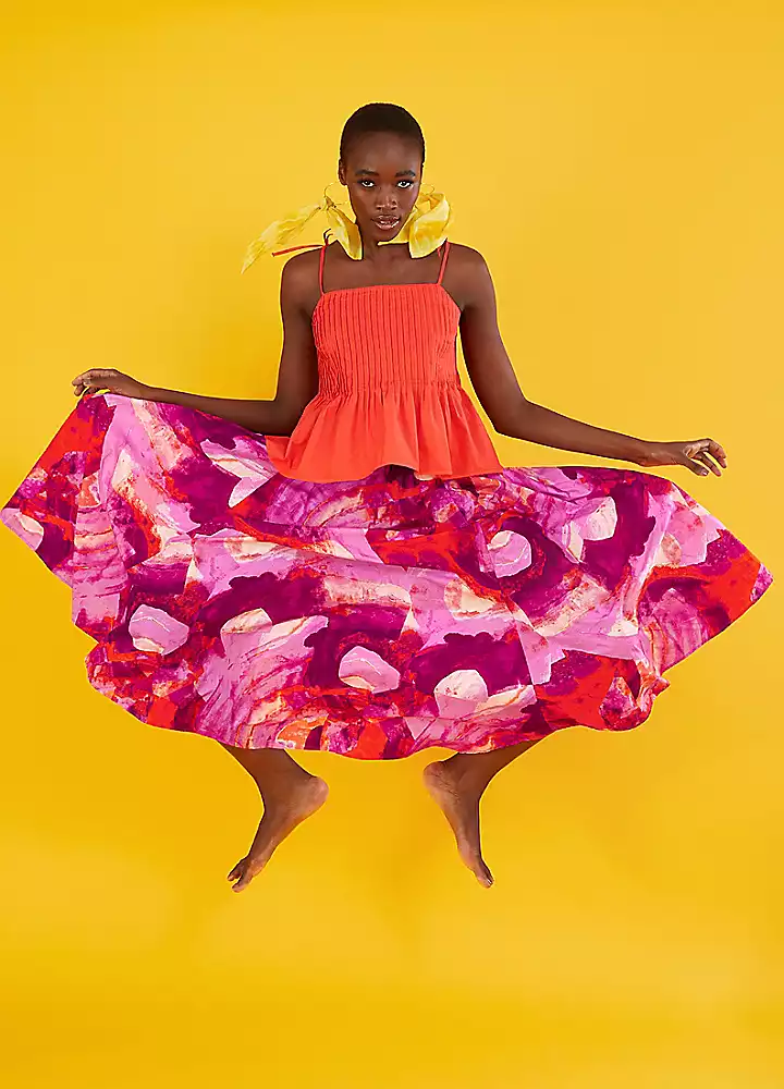 Take Khari with you to reservations at your favourite tapas bar, styled with a tucked-in blouse and sandals. Splashed in an abstract print, it has a flared profile with a comfortable elasticated waist and pockets to finish.