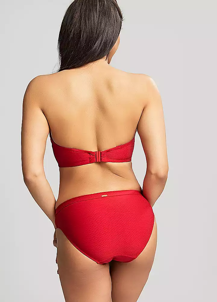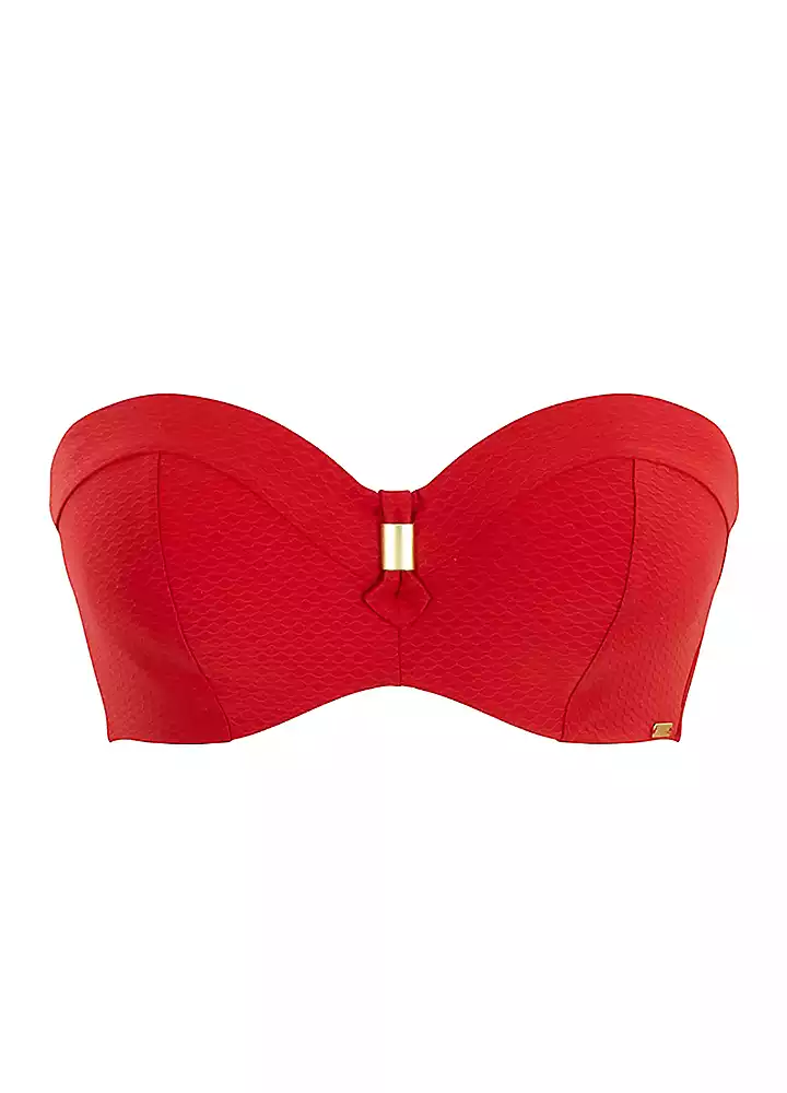 The Bandeau Bikini top features irresistible Italian fabric in a rich Crimson shade with textured detailing matt gold finishes for a deluxe finishing touch. With detachable straps for versatility and alternative style choices, whilst allowing for extra support if needed. Cut and sew foam cups provide great shape and maximum support for a strapless style and the powermesh wings provide a premium fit. Pair with matching briefs.