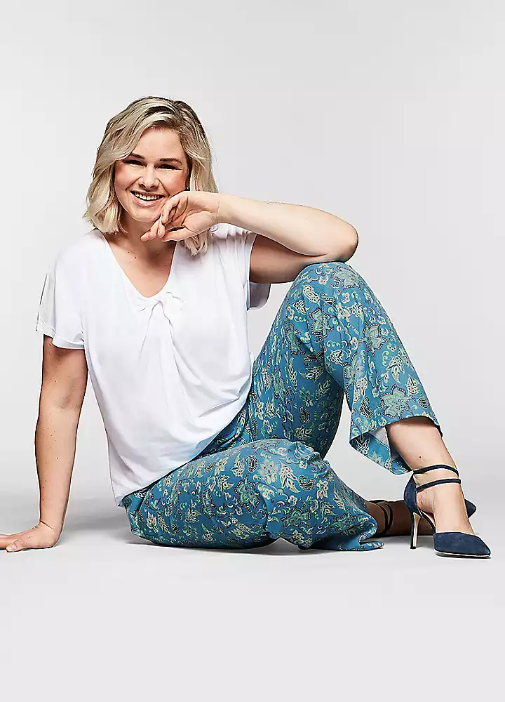 Trousers with wide leg. All-over print. Molding waistband with two buttons and zipper. With waistband folds and two lateral pockets. Made of soft flowing quality.