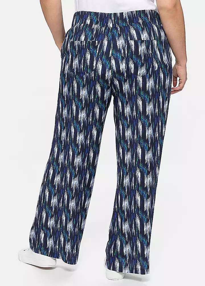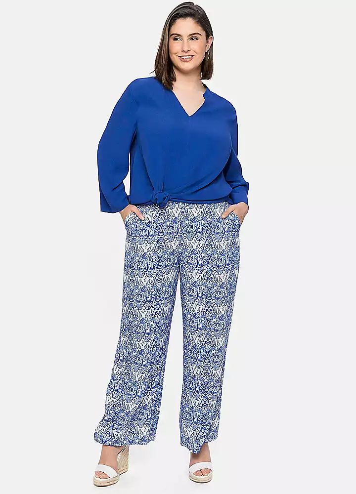 The wide-cut Sheego trousers have a summery touch thanks to the eye-catching pattern. The elastic drawstring waistband is particularly comfortable, two side pockets and two patch pockets on the back complete the look. The casual, wide cut falls pleasantly loose over the legs, the soft, flowing quality is pleasantly light to wear.