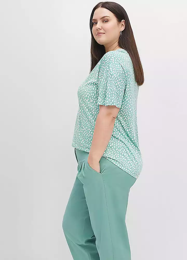 This short sleeve top by Sheego gets its feminine look from the playful minimal all-over print. Dropped shoulders and the soft, flowing quality underline the relaxed fit.