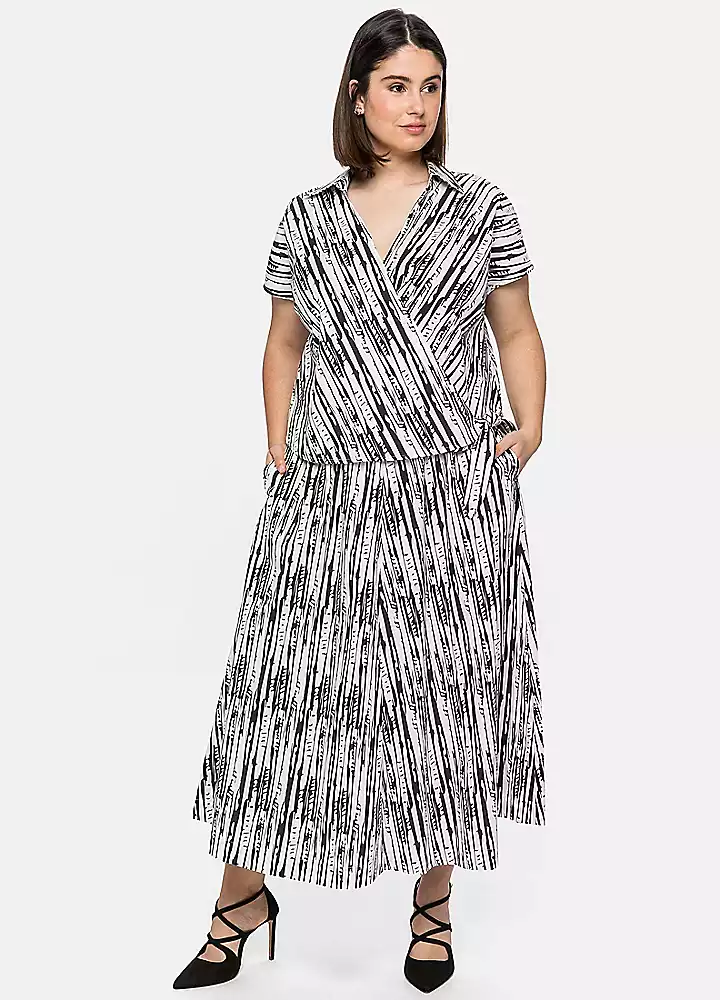 With this Sheego skirt in poplin quality, the broken, lengthwise striped print becomes an eye-catcher. The smocked elastic waistband is both comfortable and fashionable. The flared shape allows the skirt to sway beautifully, while practical pockets in the side seam complement the style. Our tip: A matching blouse is also available for this skirt. Worn together, the two parts create a very special look.