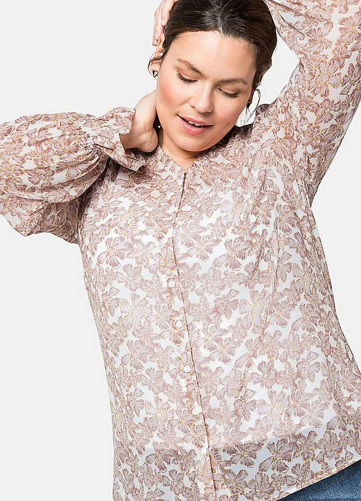 This sheer chiffon blouse from sheego is beautifully delicate and gauzy. In a collarless design, it is fitted with a V-neck with a narrow frill, and its subtly coloured all-over print and smocked sleeve cuffs underline its feminine look. It’s slightly elongated back with rounded hem drapes softly over the thighs, and a ruffled yoke at the back provides the perfect finishing touch.