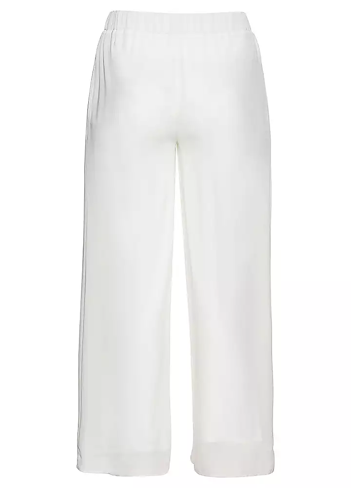 These chiffon trousers by Sheego in the palazzo style show off their feminine charm. It is elegant and yet comfortable with an elasticated drawstring waistband. The elegant width in combination with the slightly structured, softly flowing chiffon makes the trousers a styling highlight for very special occasions. With a matching top it becomes a wedding outfit. So that the pants are opaque, they are worked with an elastic Interlook lining.